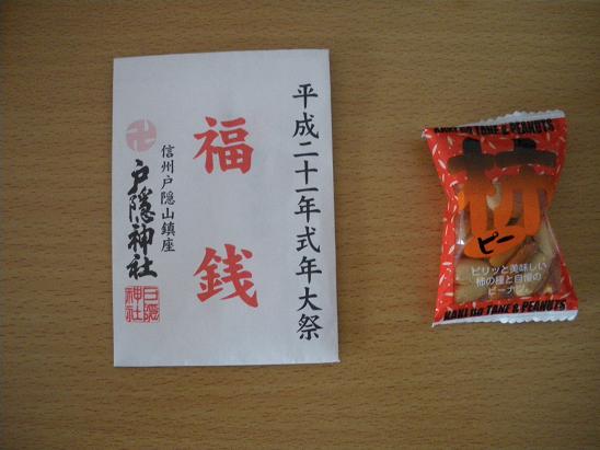しかしながらヨメが幸いにもゲットしていたようで、投げていたのは2種類、小さな柿ピーの袋と戸隠神社の福銭と判明。こ、これはご利益ありそう。
